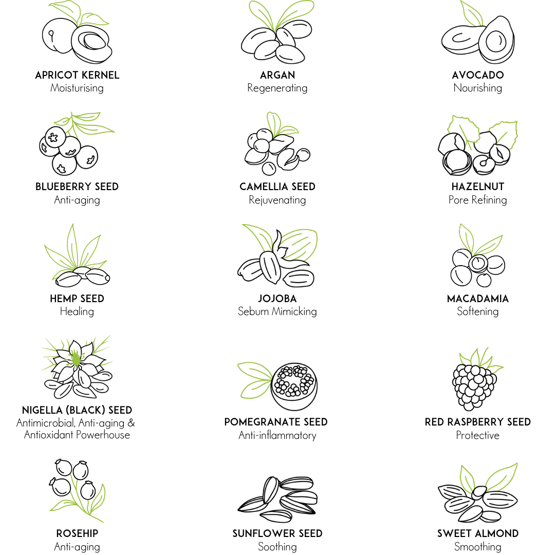 As the base for ALL our ORGANIC FACE & BODY OILS, our Signature Base Oil Blend comprises these 15 ORGANIC, COLD PRESSED & Minimally processed Carrier Oils:
